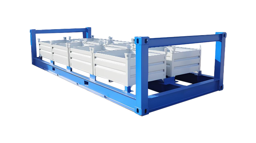 The Flat Rack for Storage Bins is a durable, heavy-duty solution designed to safely organize, store, and transport multiple storage bins. Constructed from galvanized structural steel, this rack holds up to eight bins, each measuring 1200x1000x600 mm, with a total weight capacity of approximately 1480 kg. Its open-frame design ensures easy access, efficient handling, and stability during transportation. Ideal for industrial and commercial operations, the flat rack offers secure handling of tools, equipment, and materials while complying with international shipping regulations. Its sturdy construction makes it a reliable asset for warehouses, logistics operations, construction sites, and offshore applications.